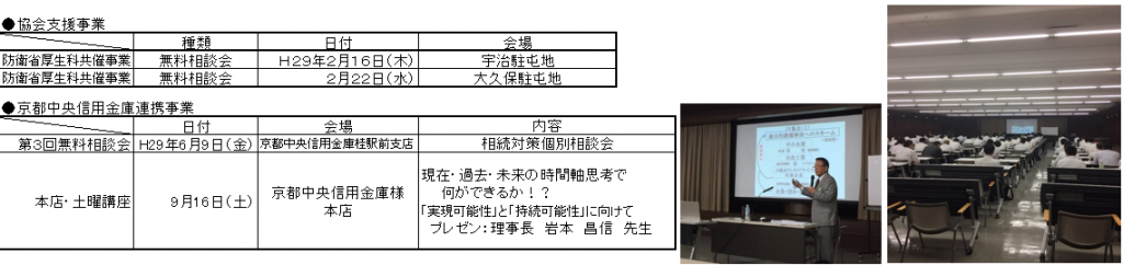 各月例会の研修テーマと講師、情報交流会と協会支援の